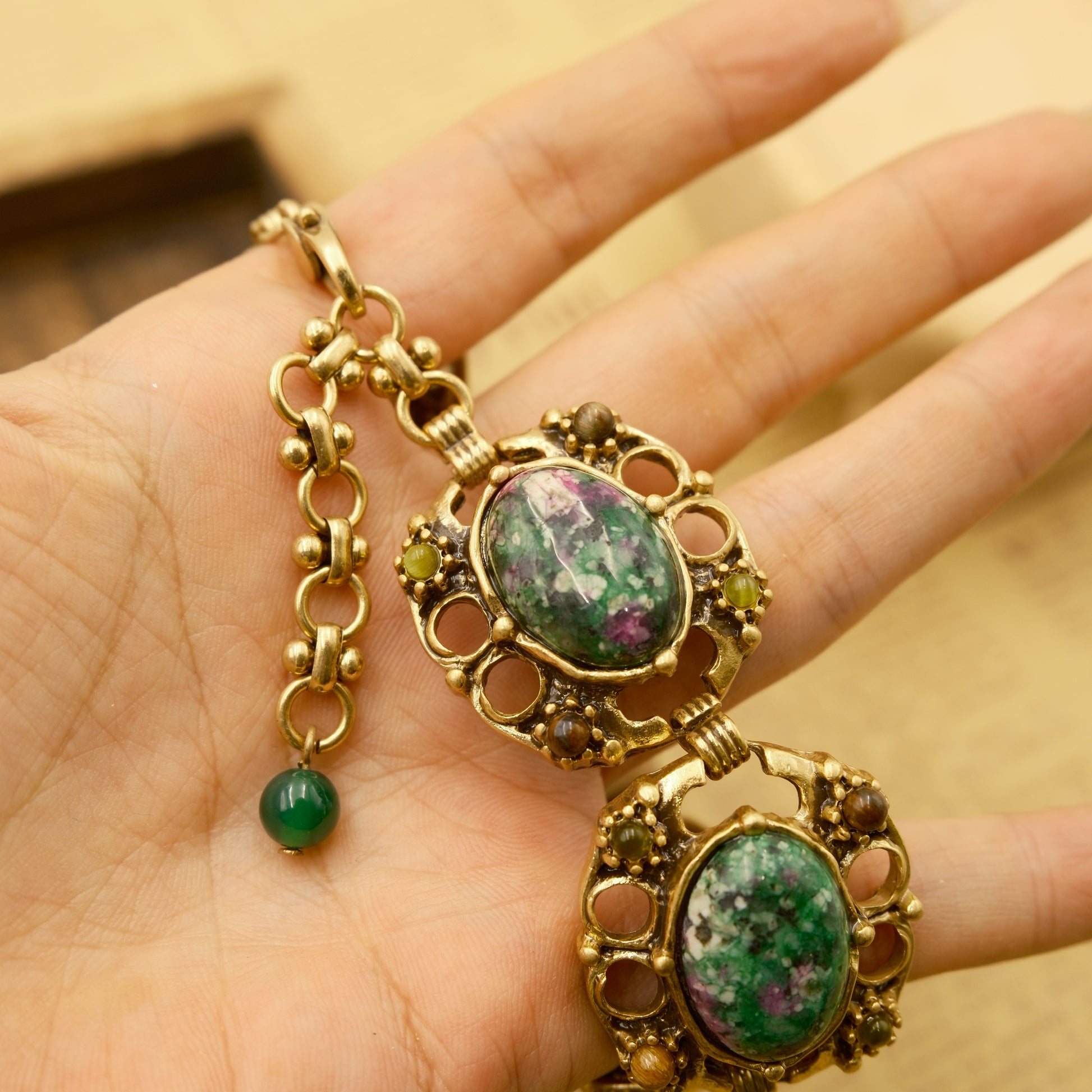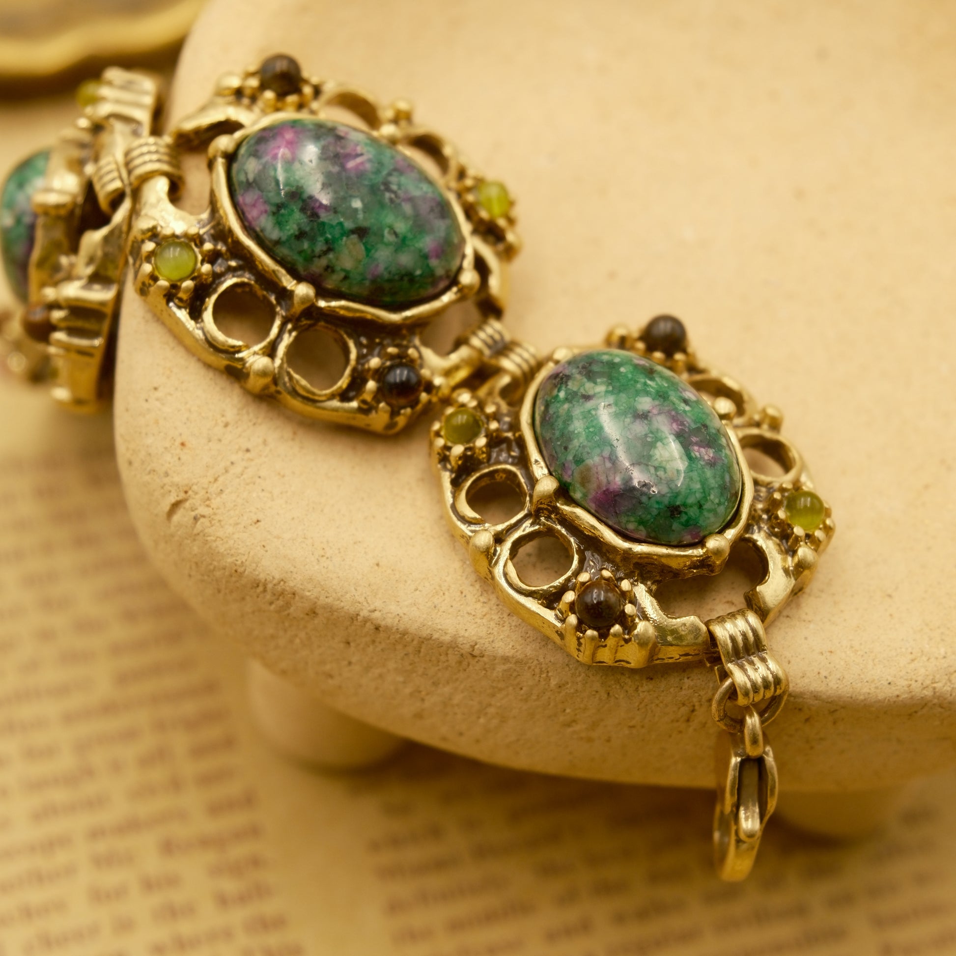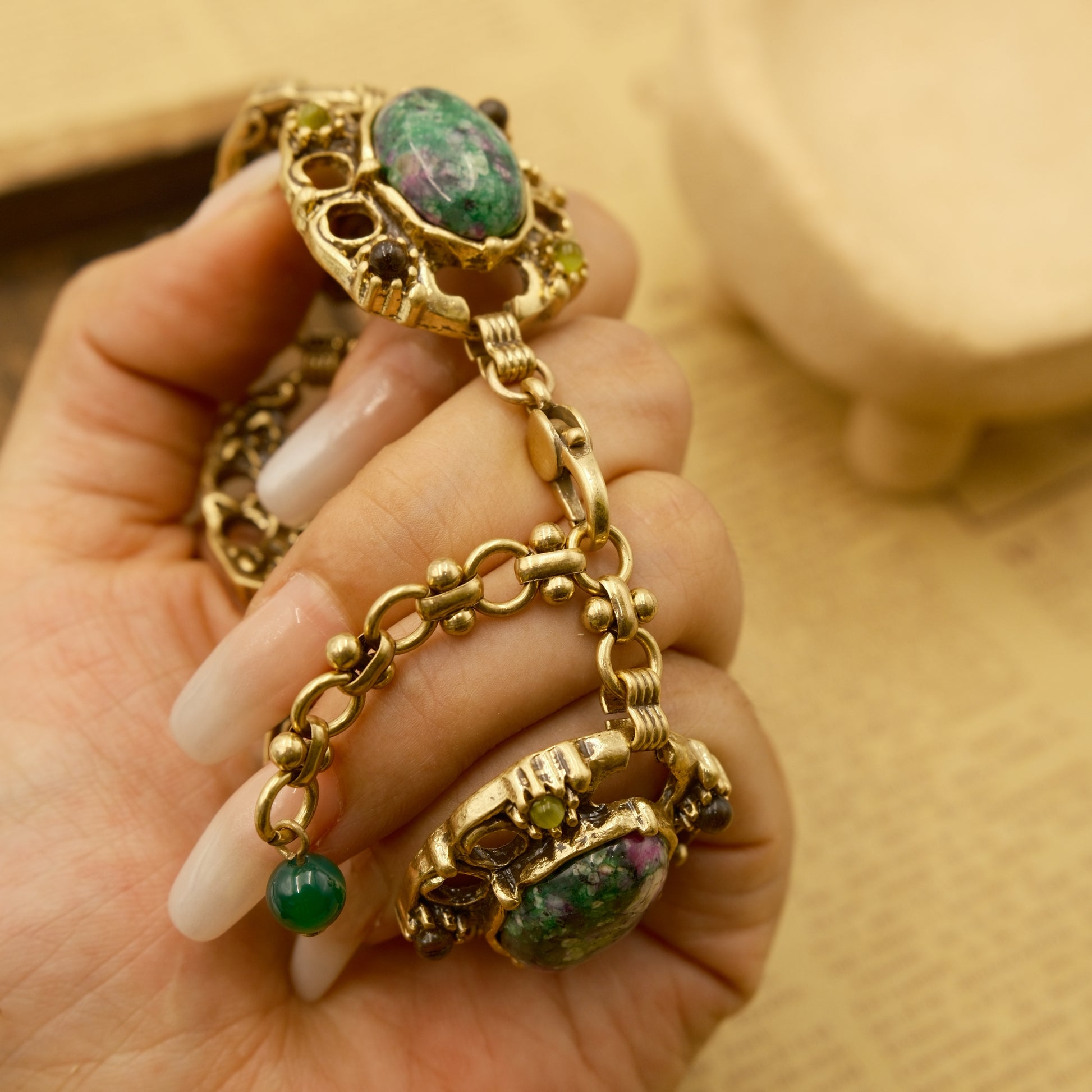 Featuring a vintage-inspired design with timeless appeal, this bracelet boasts a copper base plated with genuine gold in a distressed finish, centered with watermelon stone for a striking pop of green hue and retro charm.