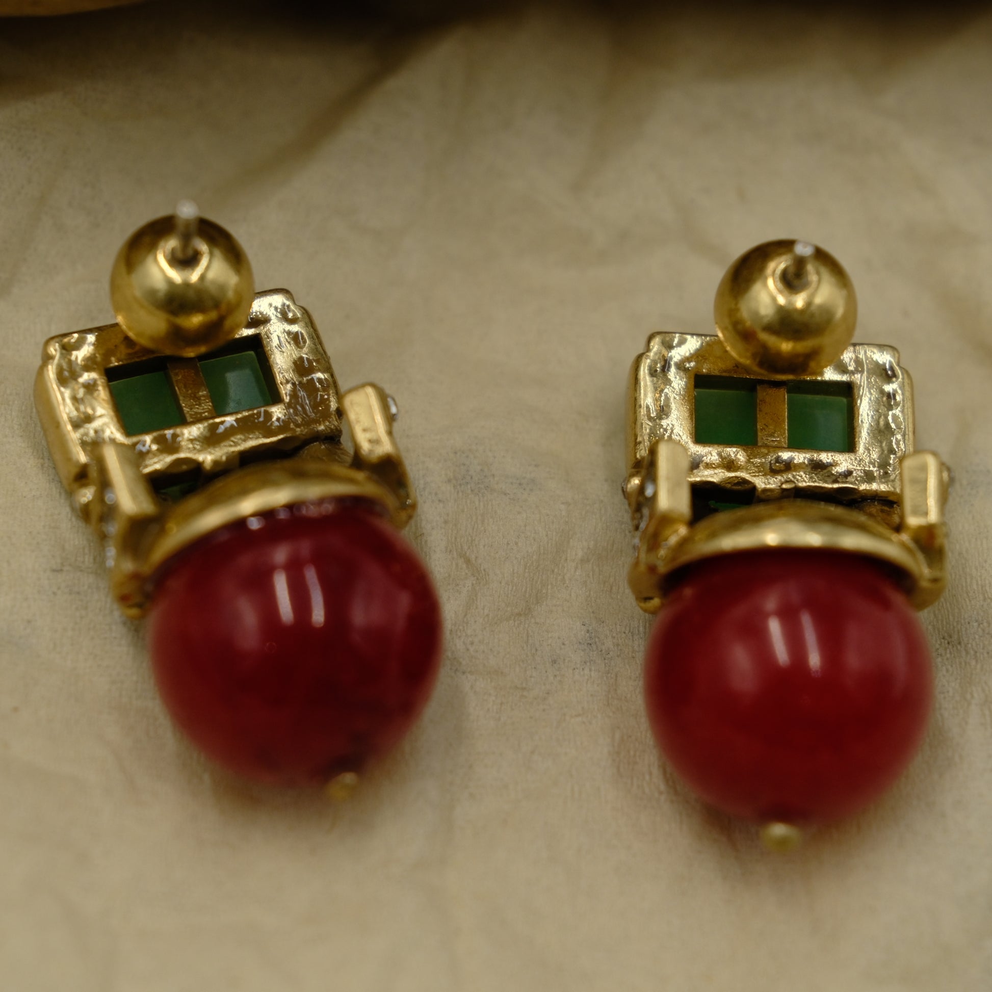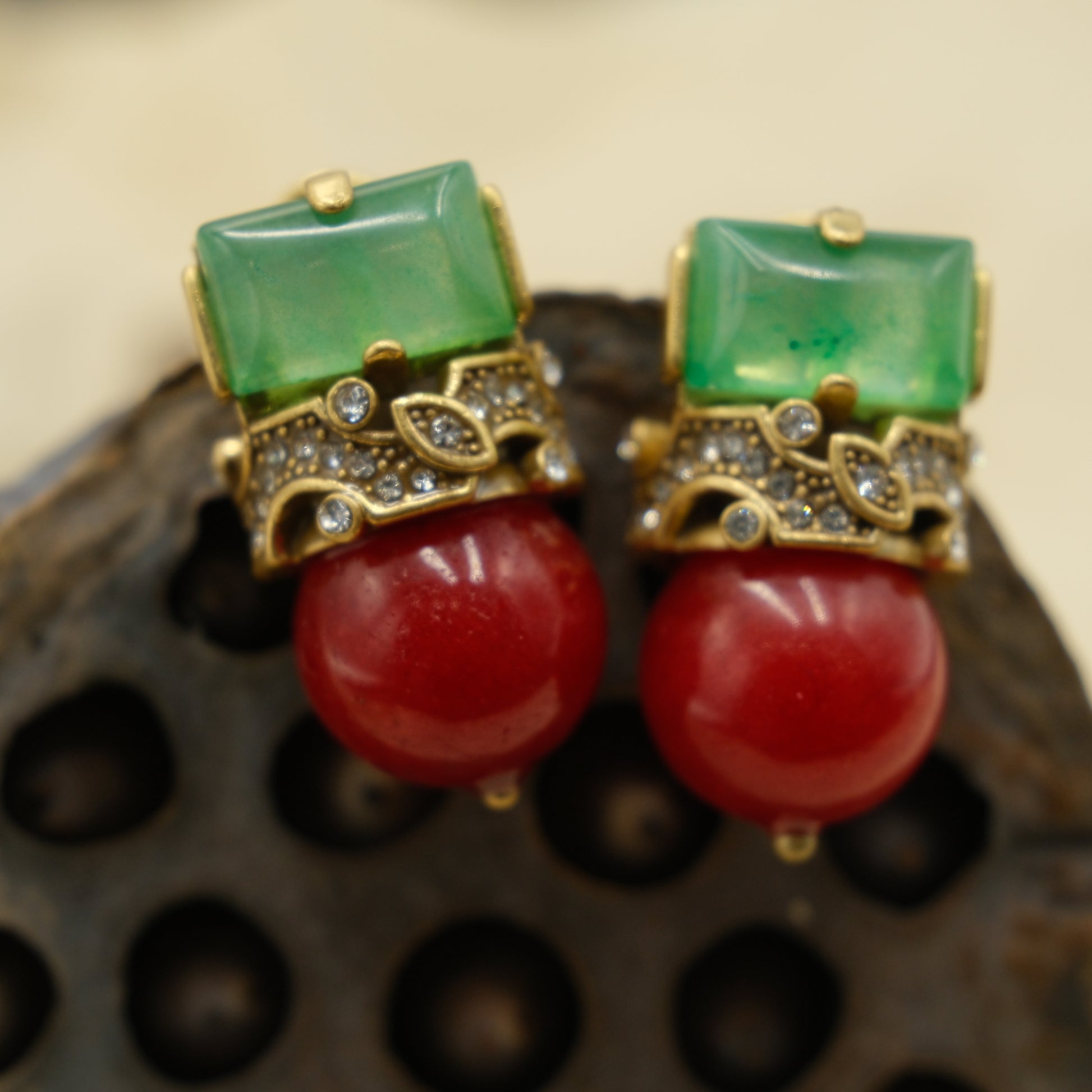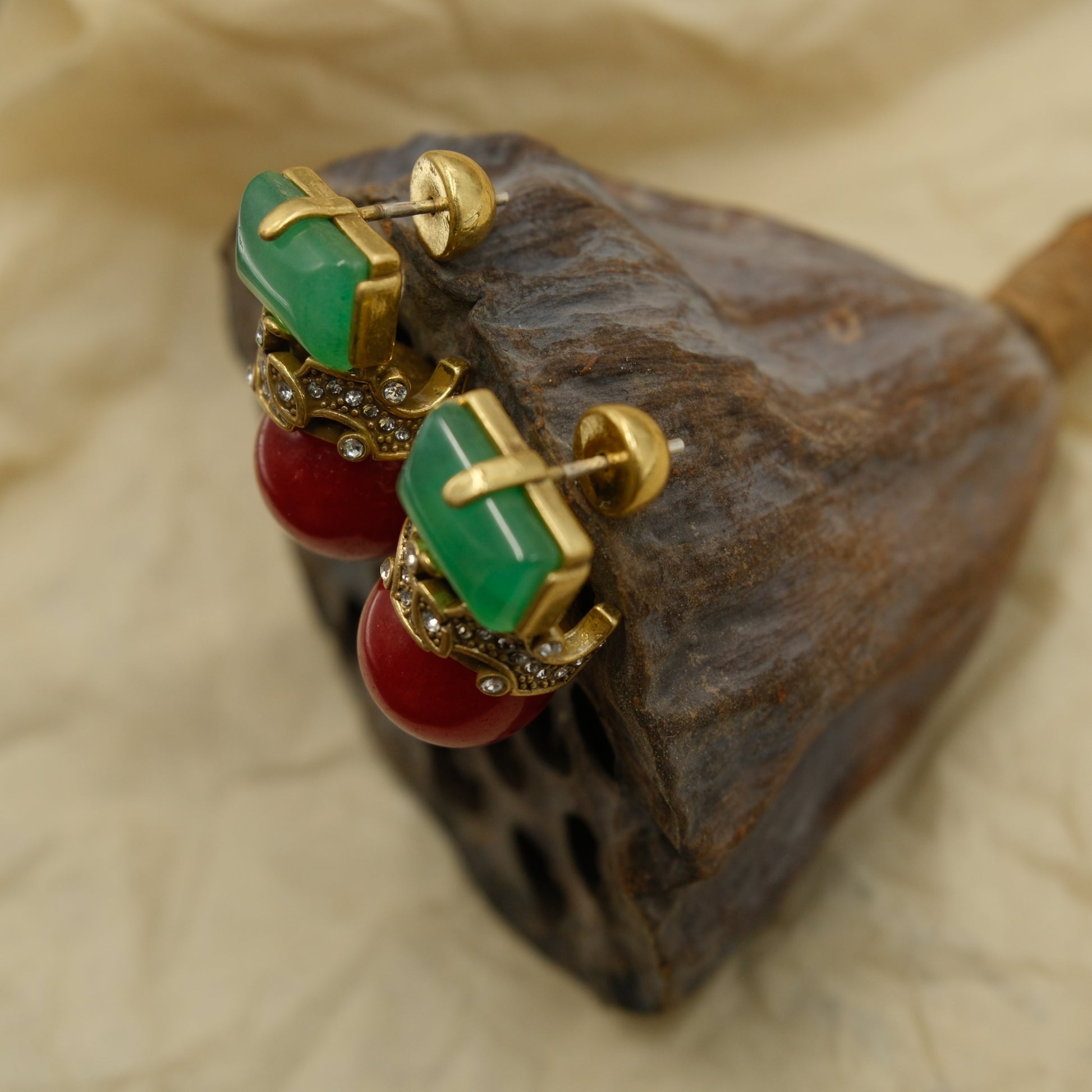 Featuring a square pendant design with vintage character, these earrings boast a copper base plated with genuine gold in a distressed finish, highlighted by natural stones including green agate and red agate for a unique retro charm.
