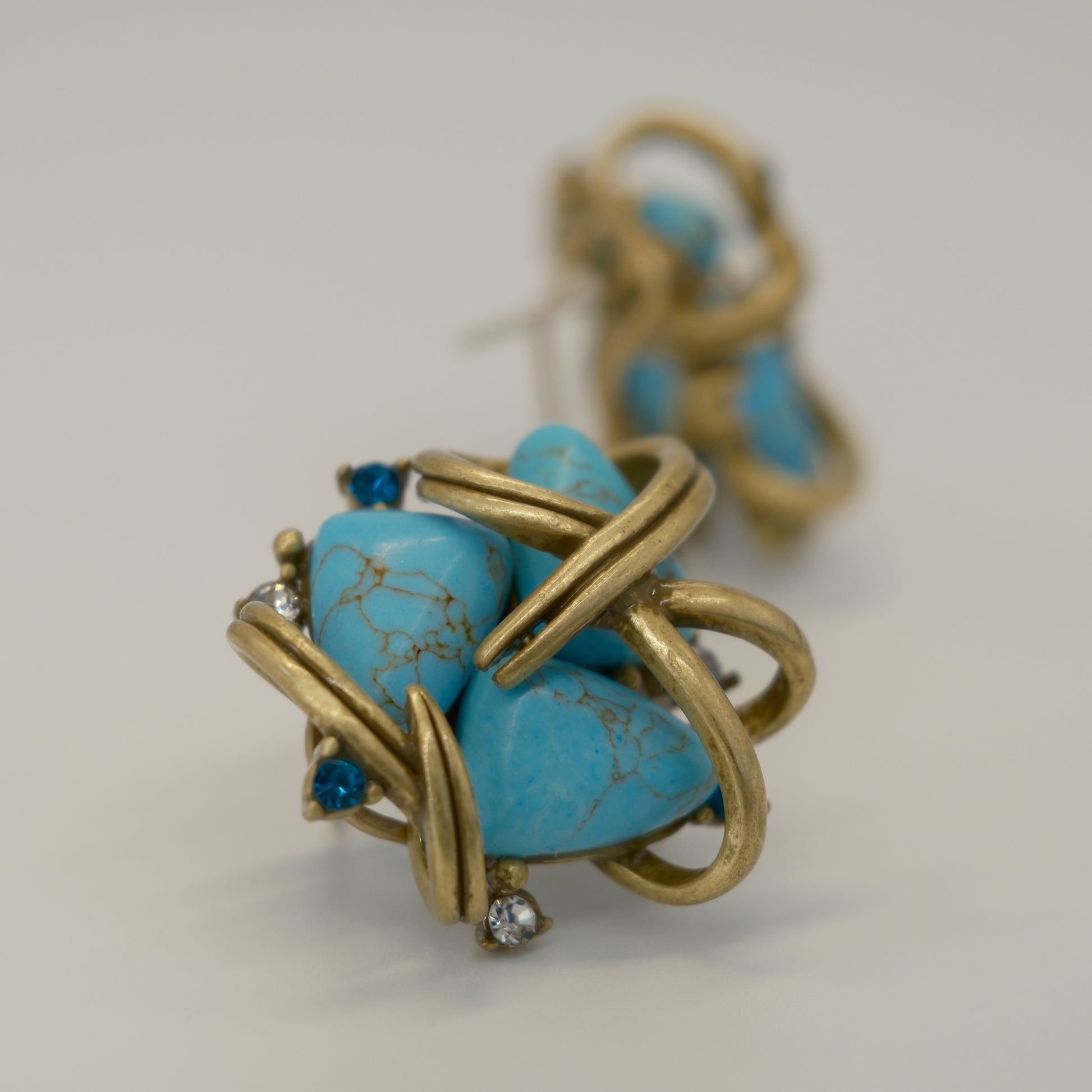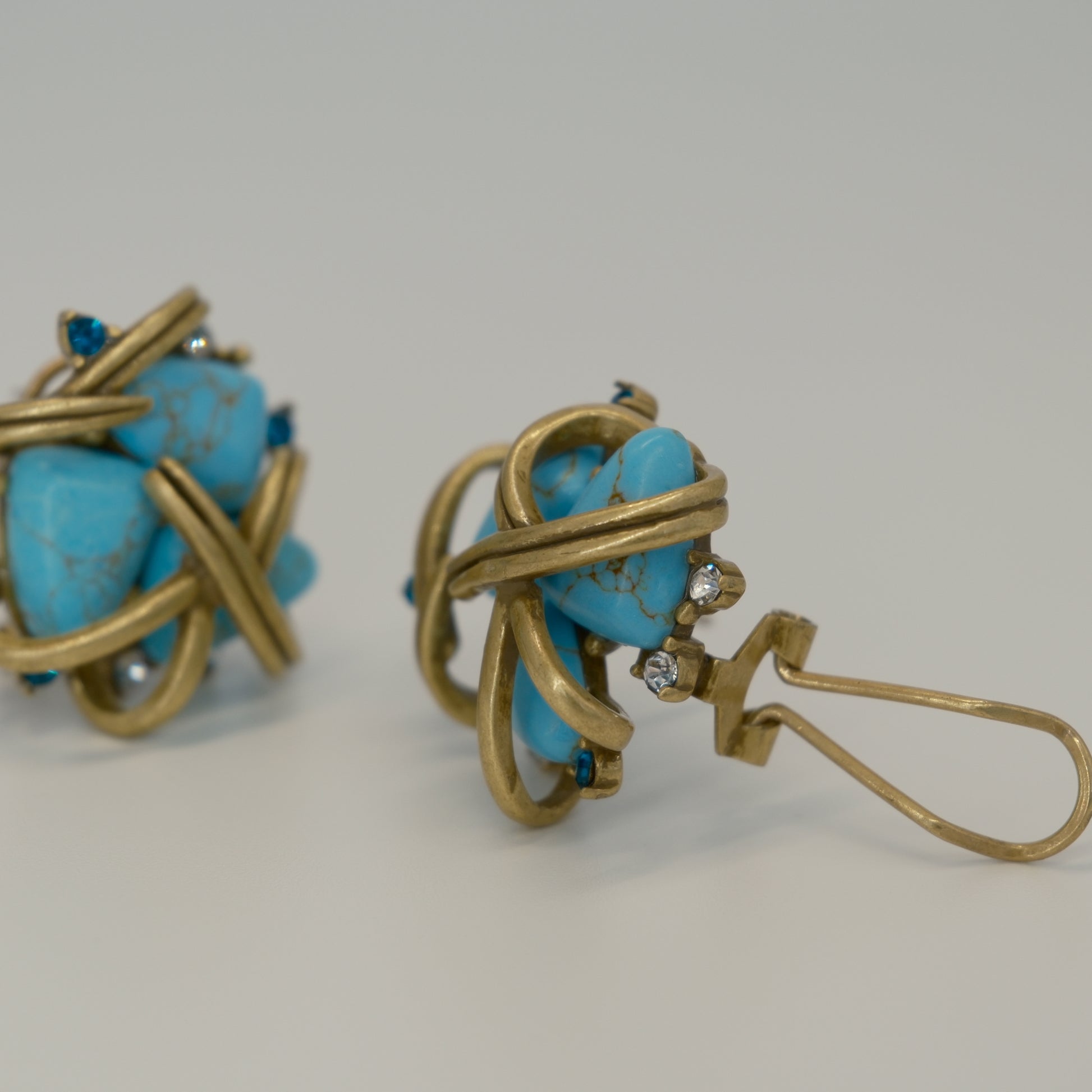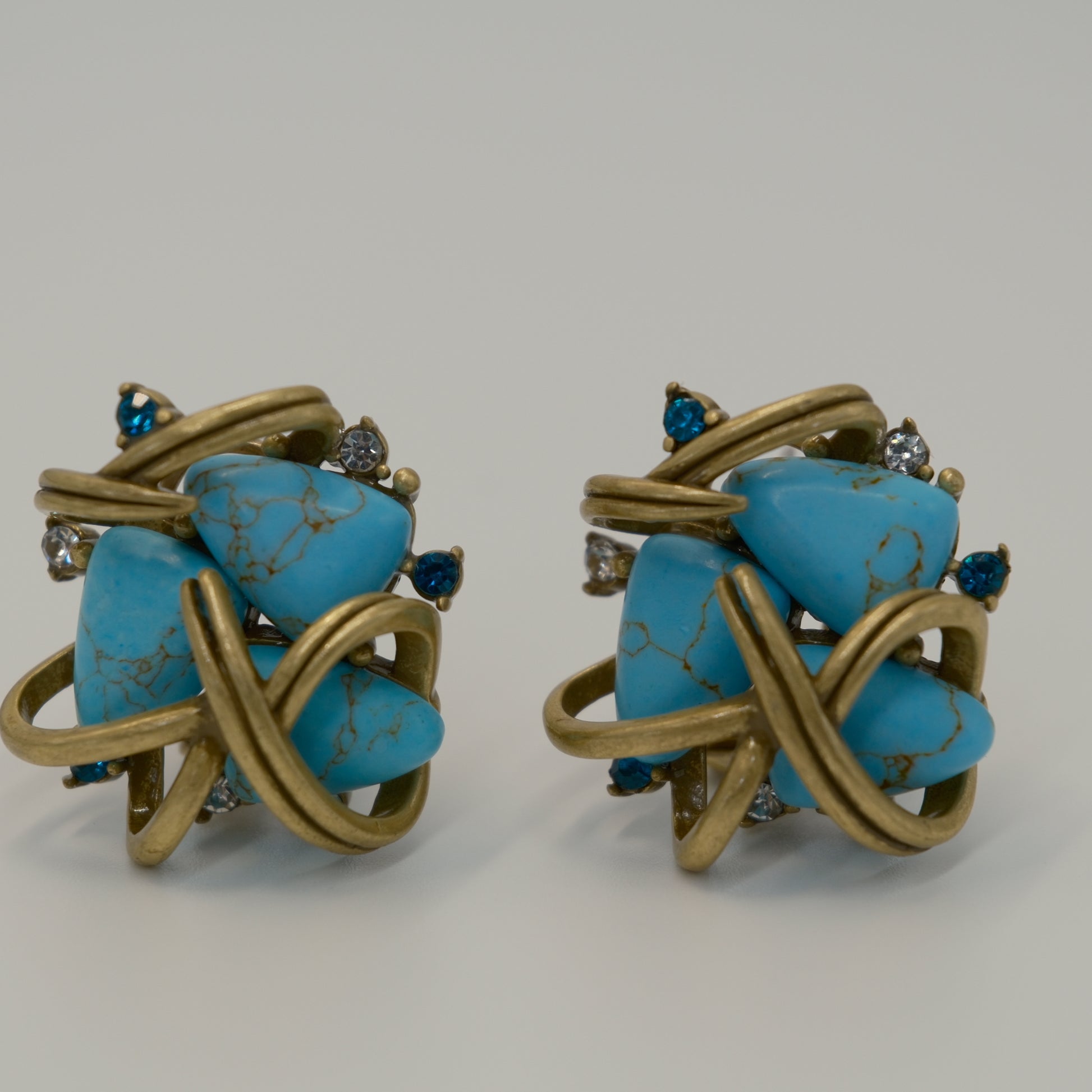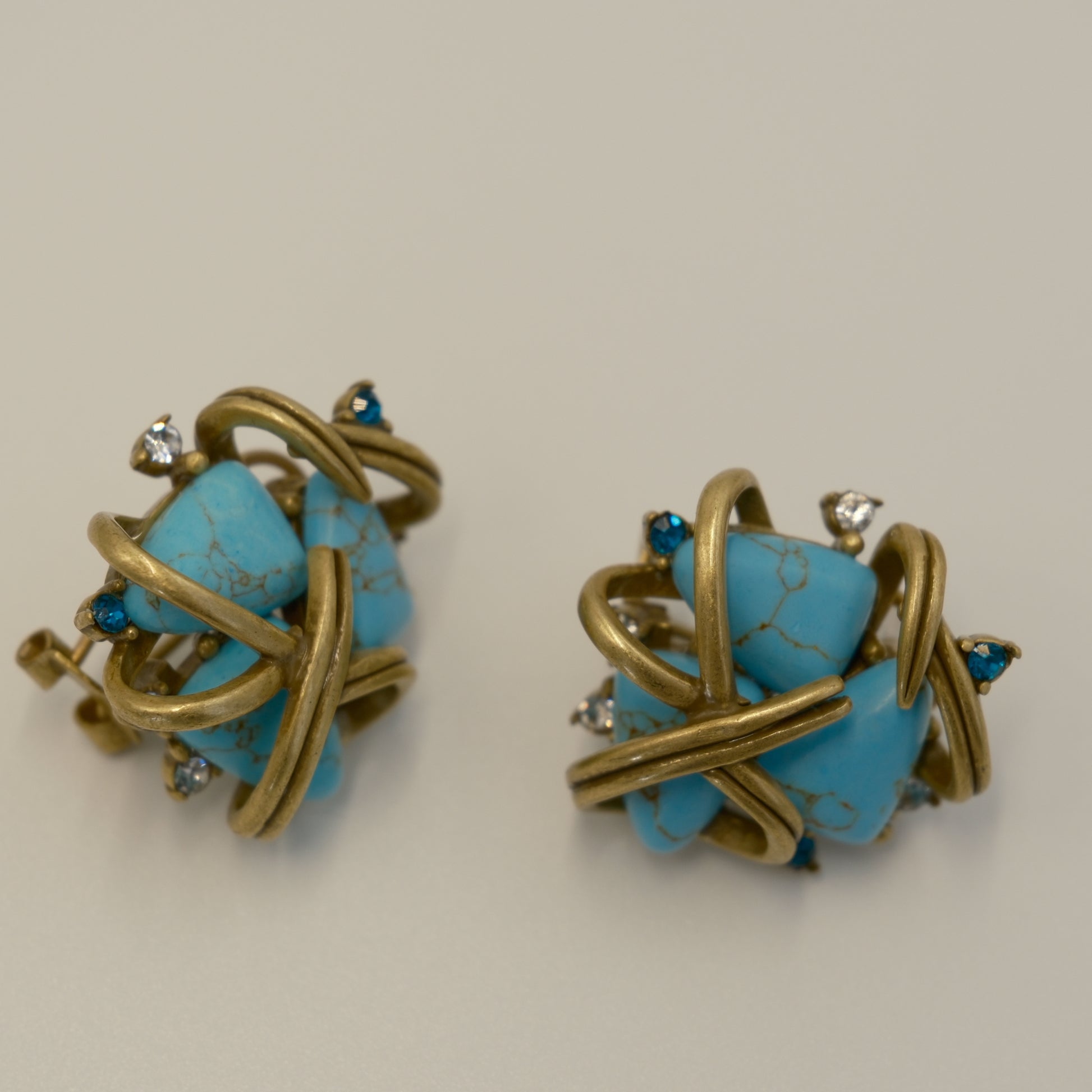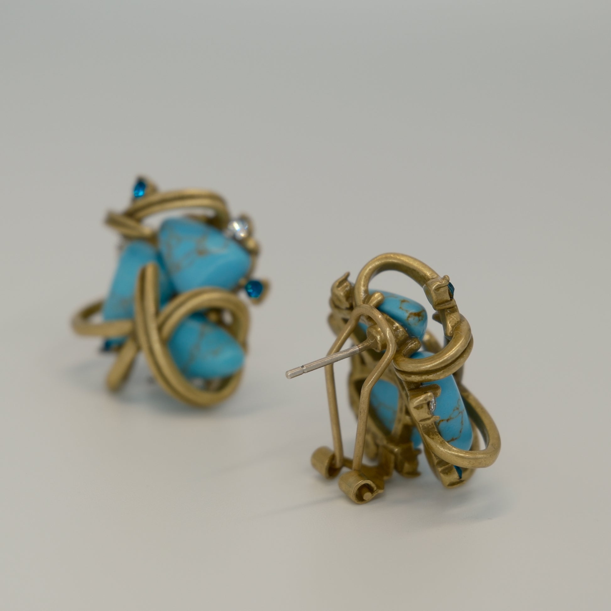 Vintage Distressed Gold-Plated Copper Turquoise & Diamond-Inlaid Earrings: Tiffany-Inspired Gold-Plated Copper (Distressed) + Turquoise