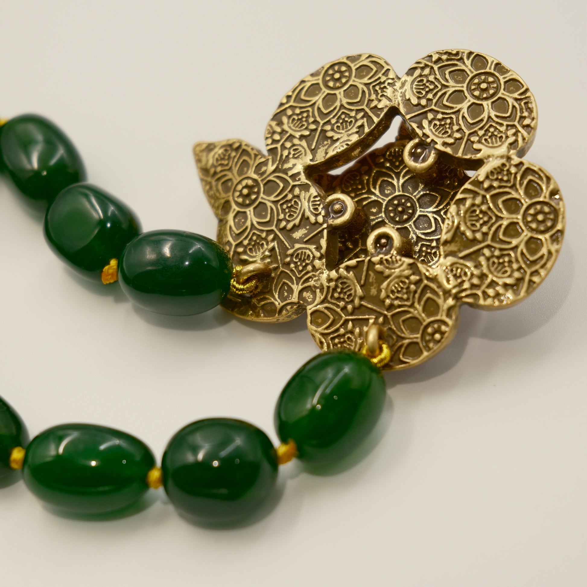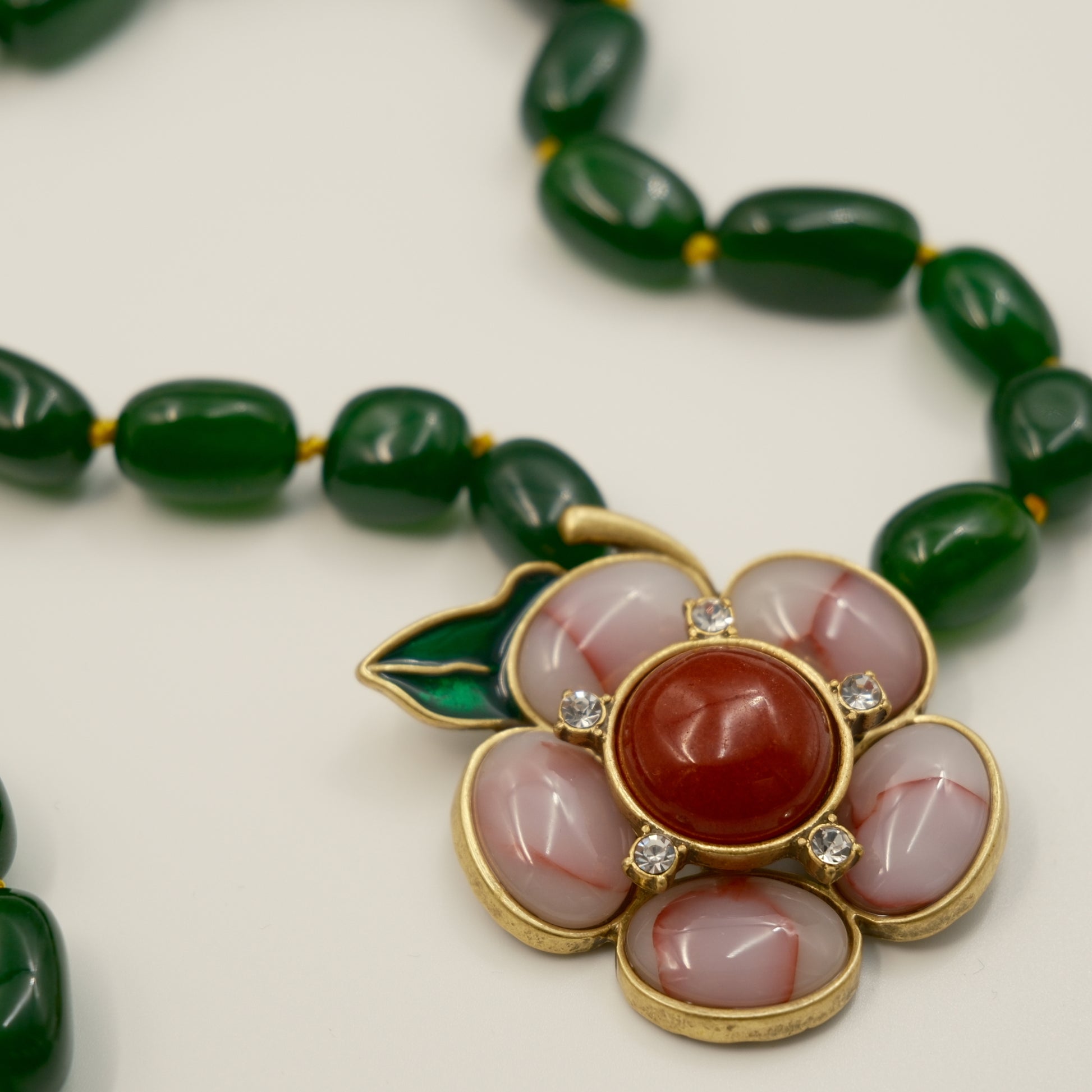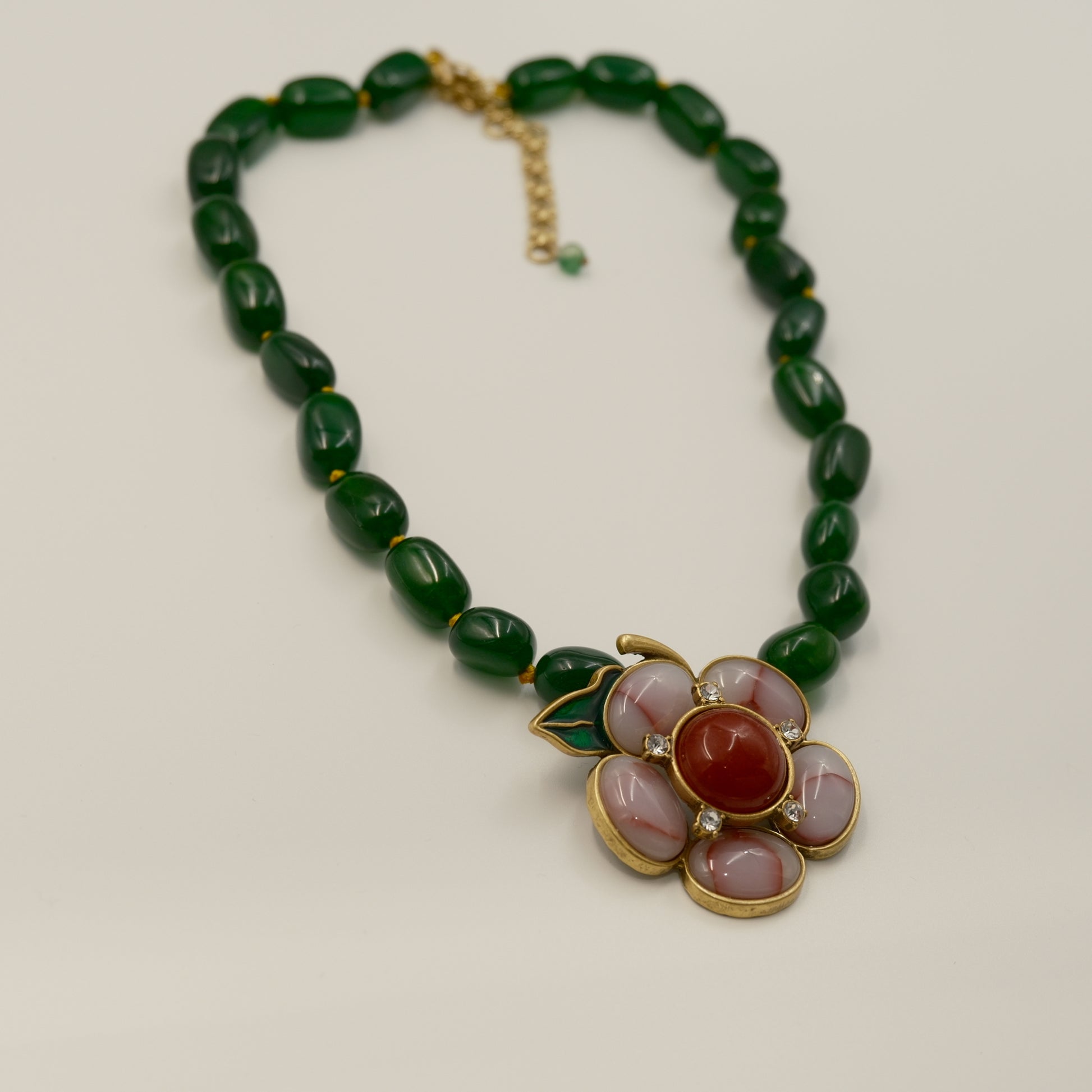 Vintage Flower Necklace with Green Agate, Red Natural Stone & Inlaid Pink Agate